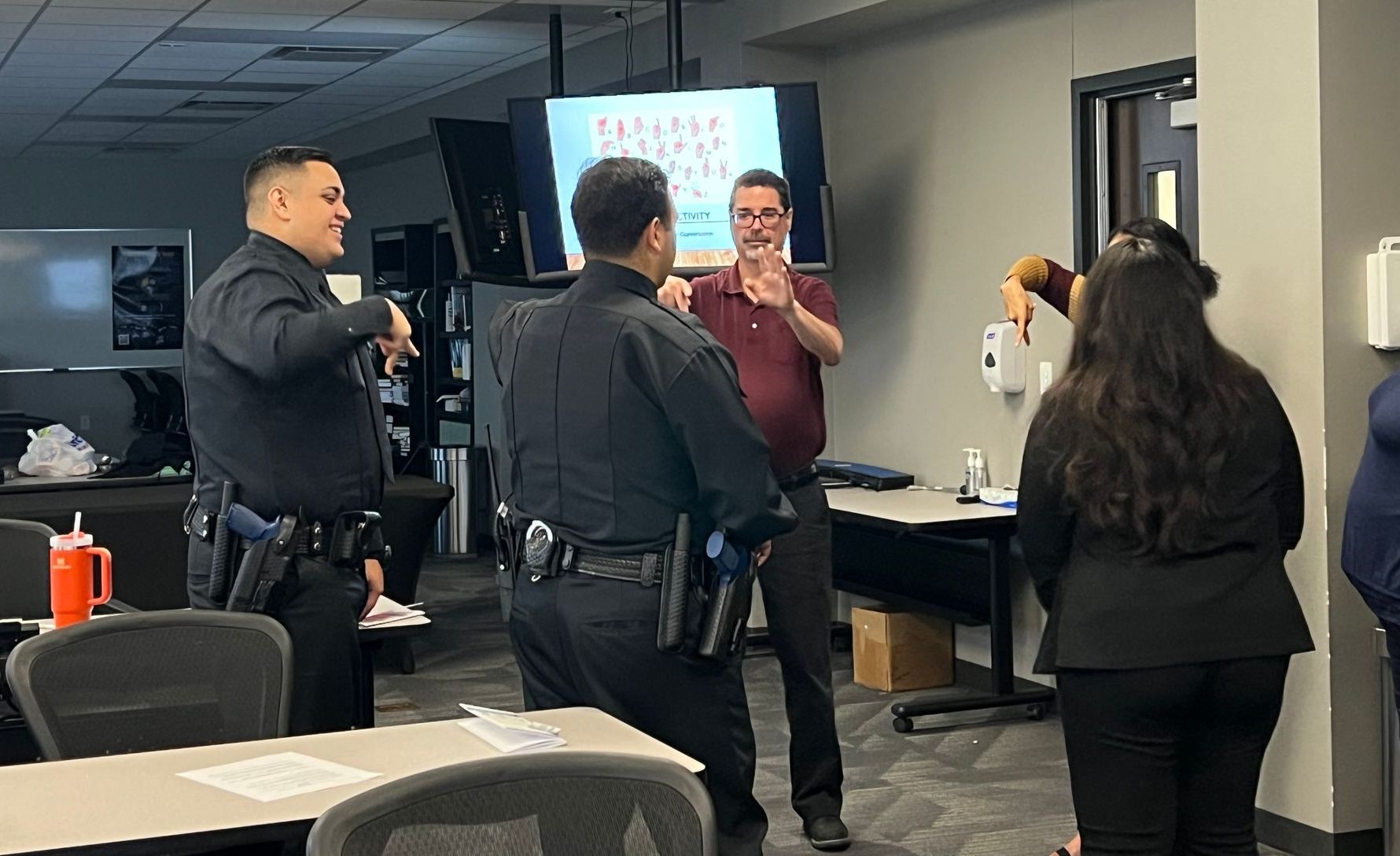 We provide training to Law Enforcement officers and other community organizations and agencies. In these trainings, participants learn the cultural and linguistic (ASL) aspects of Deaf community, define terms as stated by the Health and Human Services Code, perform role-play scenarios with Deaf community members, and complete testing on skills and knowledge of the training content. These trainings allow participants to practice simple communication to better make connections with their local Deaf Communities.